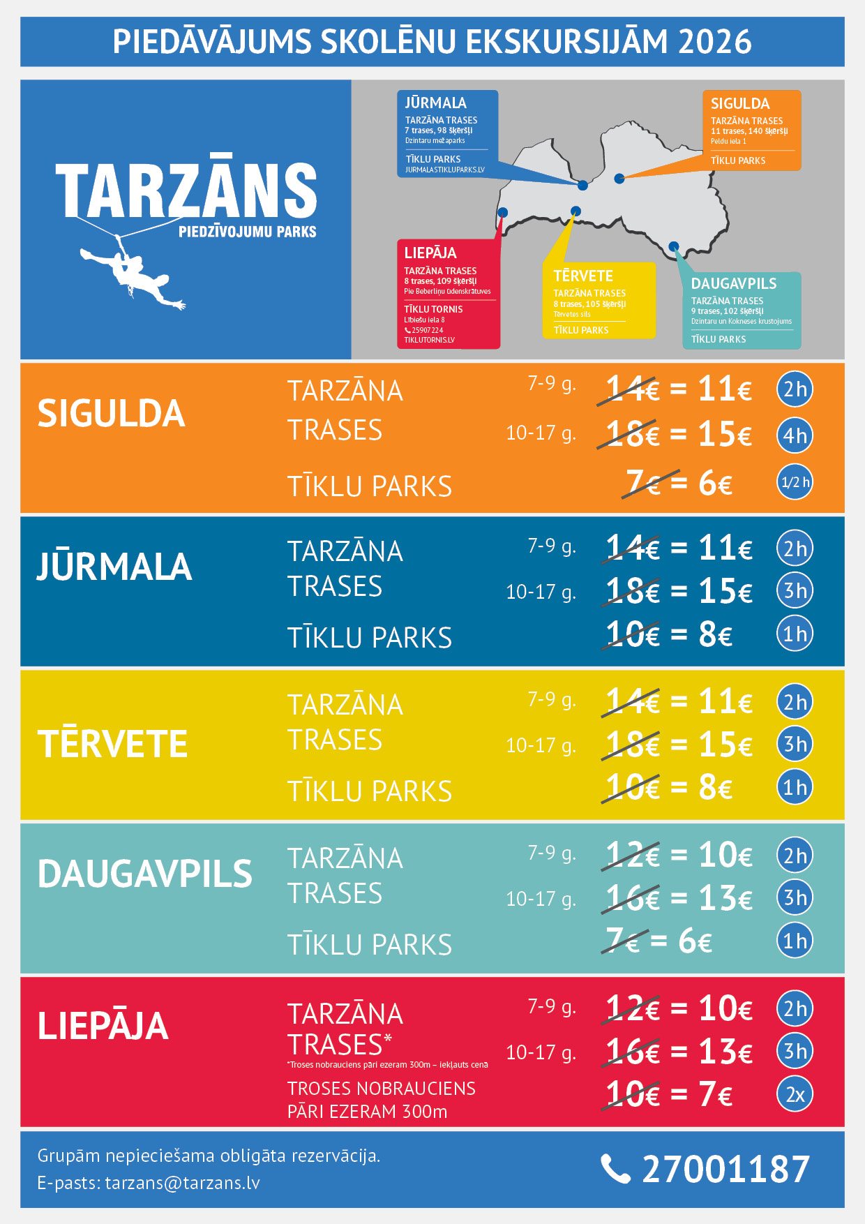 Nepieciešama obligāta rezervācija zvanot uz telefona numuru 27001187 vai rakstot uz e-pastu tervete@tarzans.lv